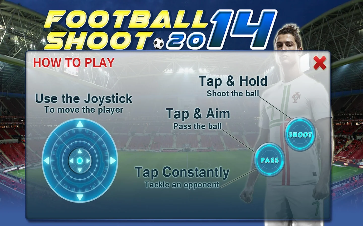 Com Football Shoot 2014 - Futebol você pode jogar com jogadores como Cristiano Ronaldo, Messi, Bale, e com grandes equipes como Real Madrid, FC Barcelona.