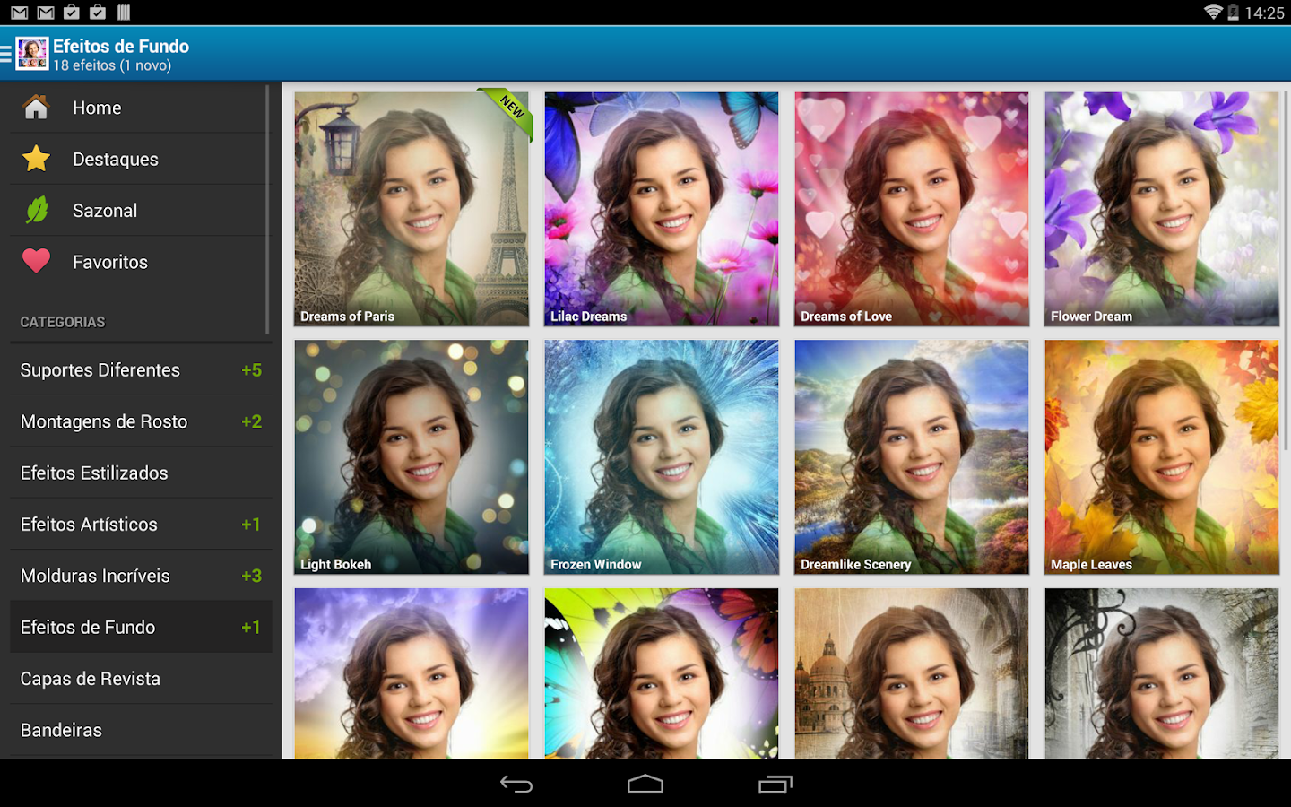 - efeitos de fundo para transformar o ambiente da sua foto em um cenário de sonho ou com delicadas asas de borboletas tropicais.