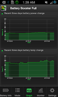 Três gráficos são dadas em Battery Booster para acompanhar a recente informação três dias de bateria, incluindo o nível da bateria, temperatura e tensão. Você pode usar essas estatísticas para analisar e descobrir o modo de economia de bateria mais eficaz para si mesmo.