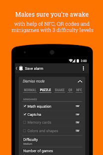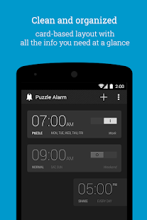 - quebra-cabeças aleatórios com cada despertador (equação matemática, cartões de memória, captcha, padrões), até 5 puzzles para resolver em uma linha,