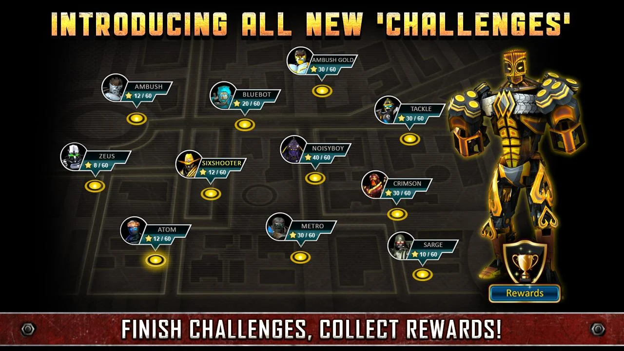 Você também pode experimentar as lutas com os outros robôs no filme , como Atom - ' Campeão do Povo " ; Zeus 'King of the Robots '; Twin Cities ' Two Headed Torre de Poder; Ambush 'The Comic Book Crusher ' , Noisy Boy ' The Manga Mangler '; Midas ' The Killer Gold- Blooded " ; ' Monstro de Frankenstein do Anel ' Metro ; Gridlock ' O Bot Bronzed Construtor de corpo '; Axelrod ' roda de fiar Punho Fighter' ; Blacktop " O Bot Out of Hell " ; Six Shooter ' O xerife de RoboTown '; BlacJac ' O Bot Casino com uma mão incrível '; Bot Azul " O azul elétrico Brawler '; Do Aqua Bot ' O Bot Diver from the Deep ' .
